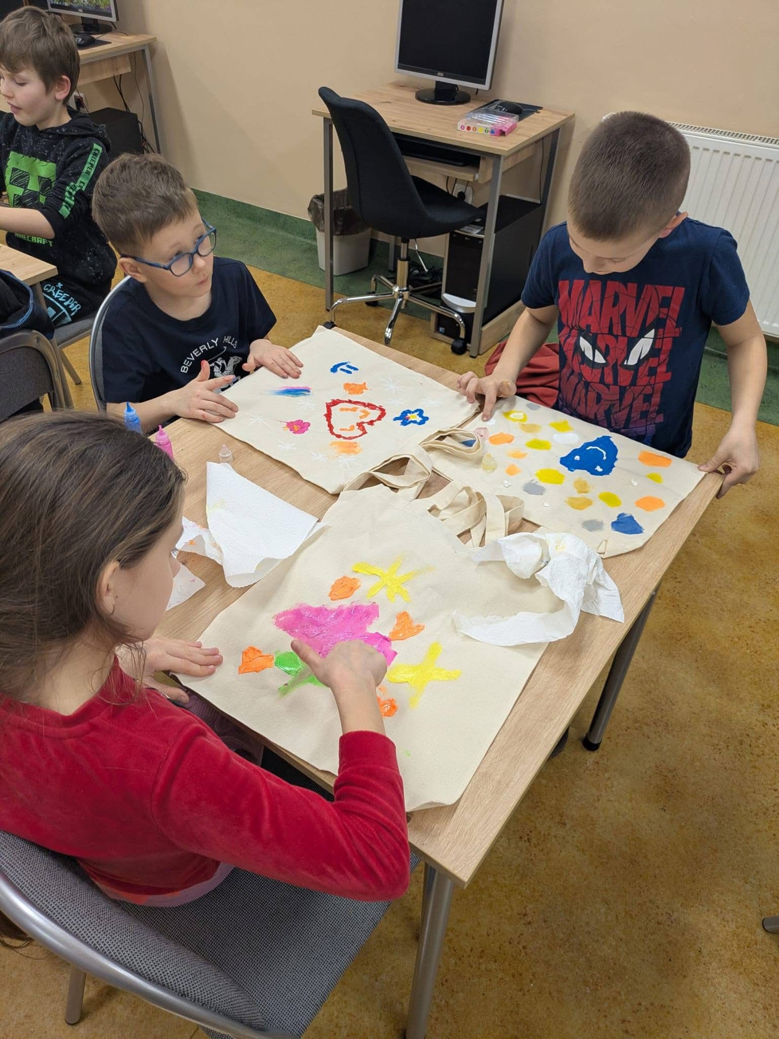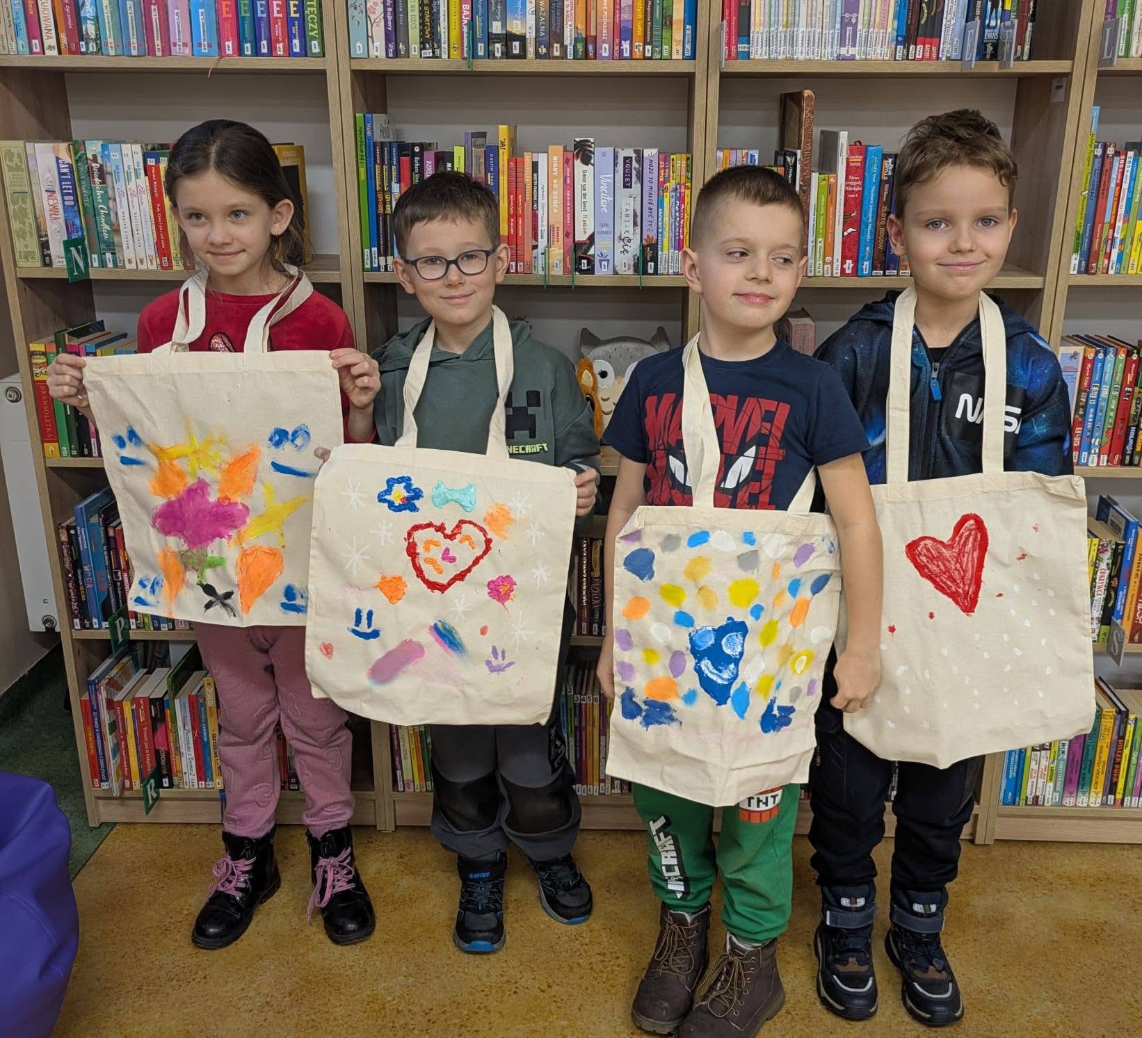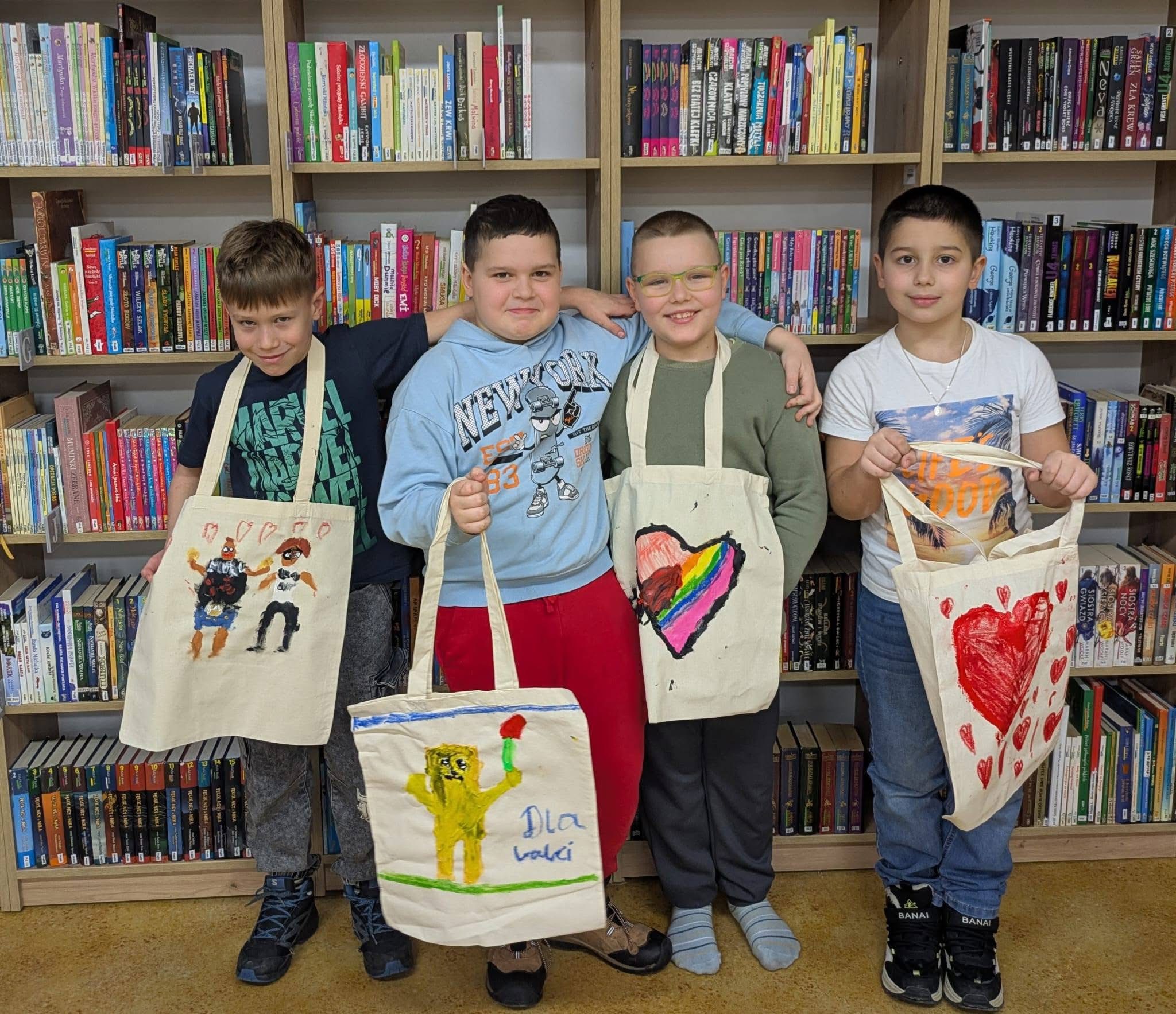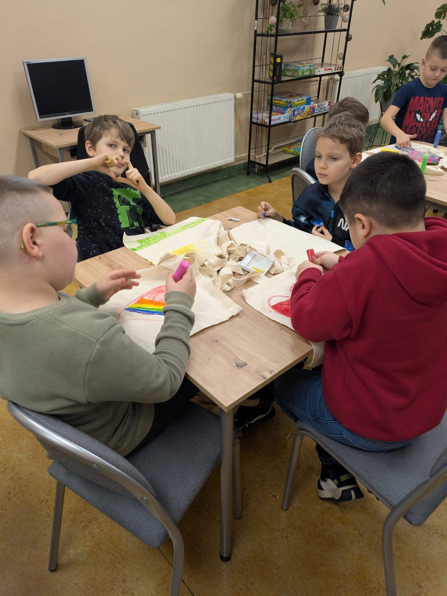 Zamiast tradycyjnych kartek, uczniowie ozdobili bawełniane torby na zakupy. Dzięki autorskim, kolorowym rysunkom, każda z nich stała się niepowtarzalnym i praktycznym upominkiem.