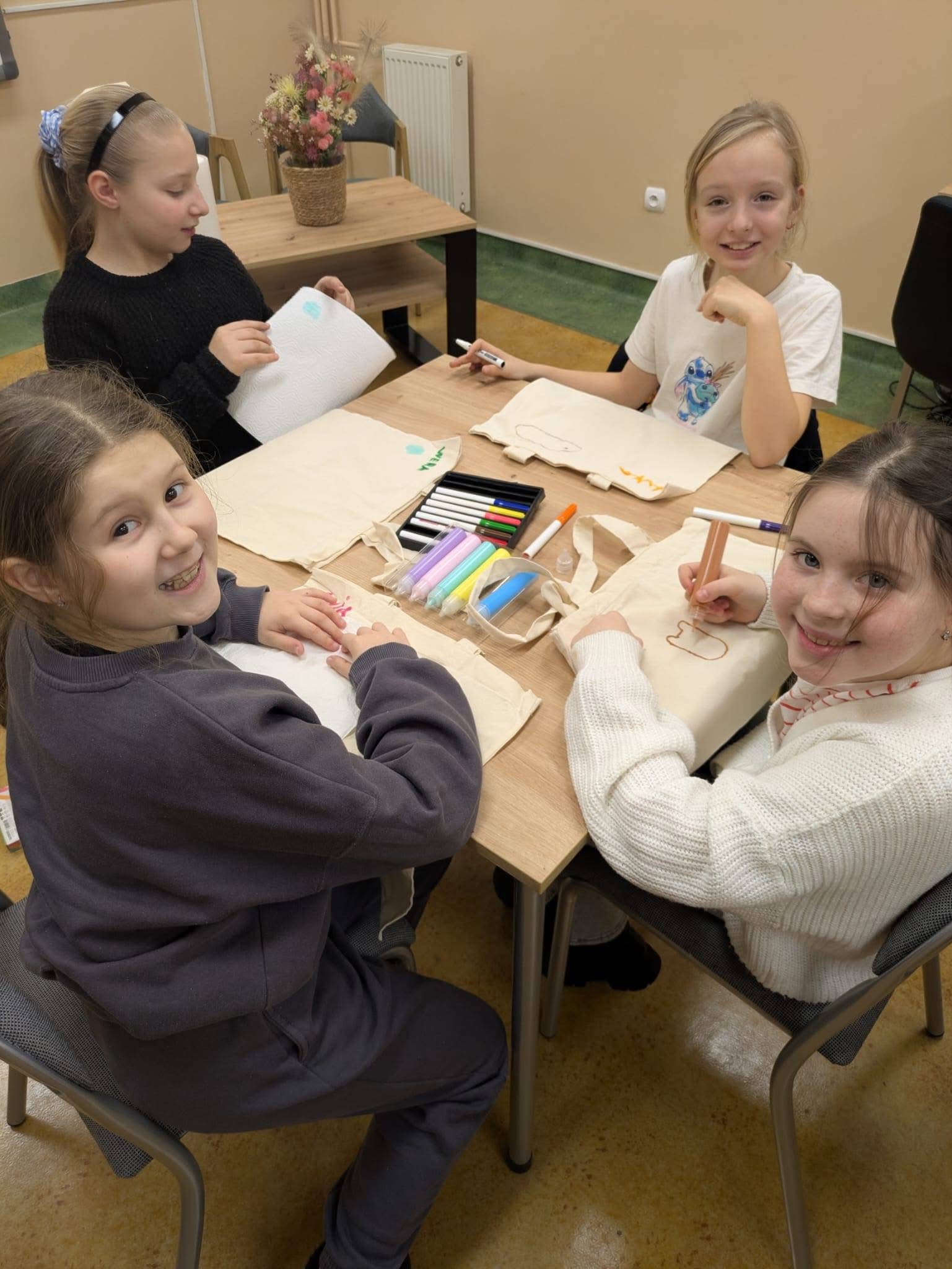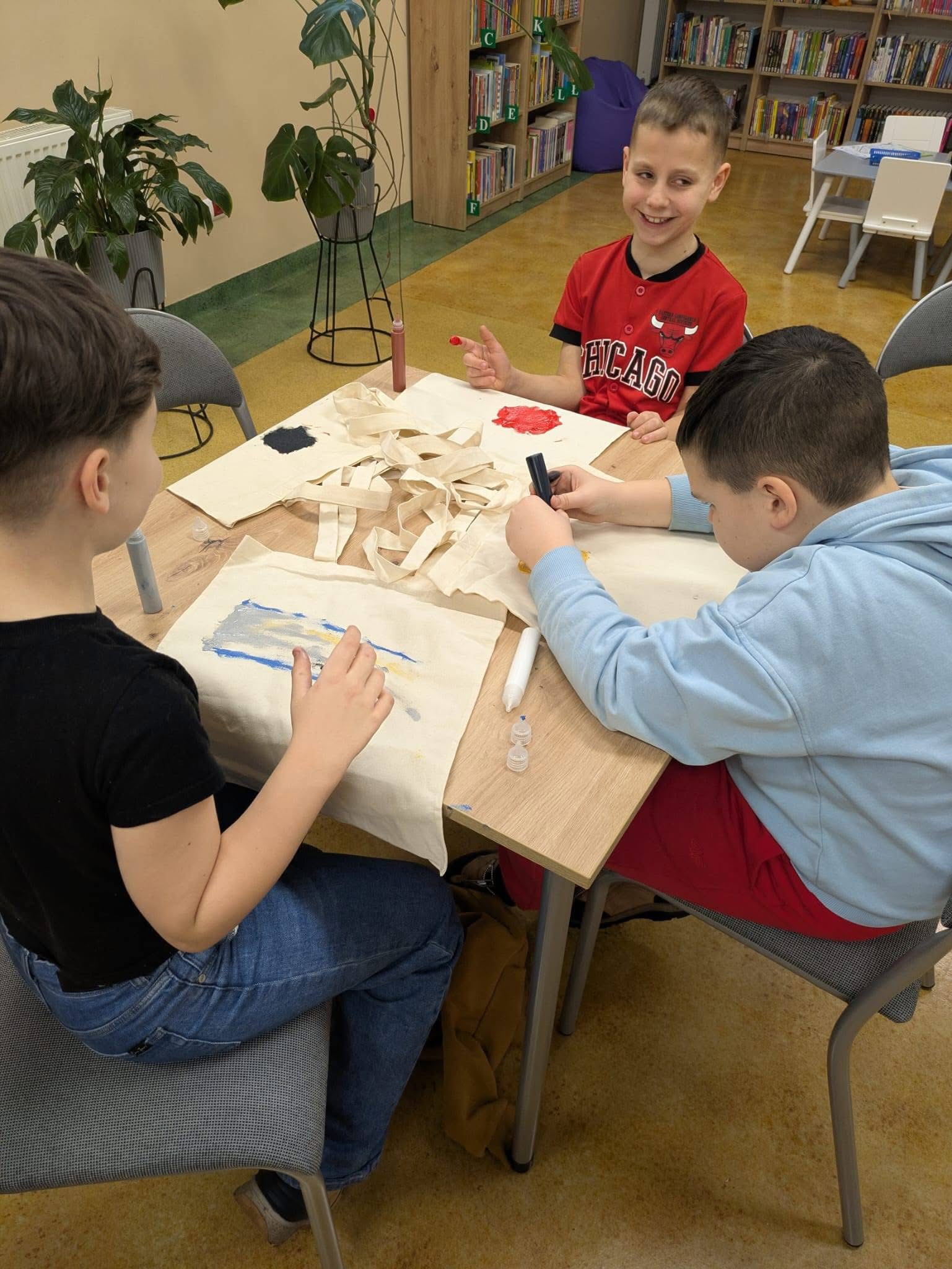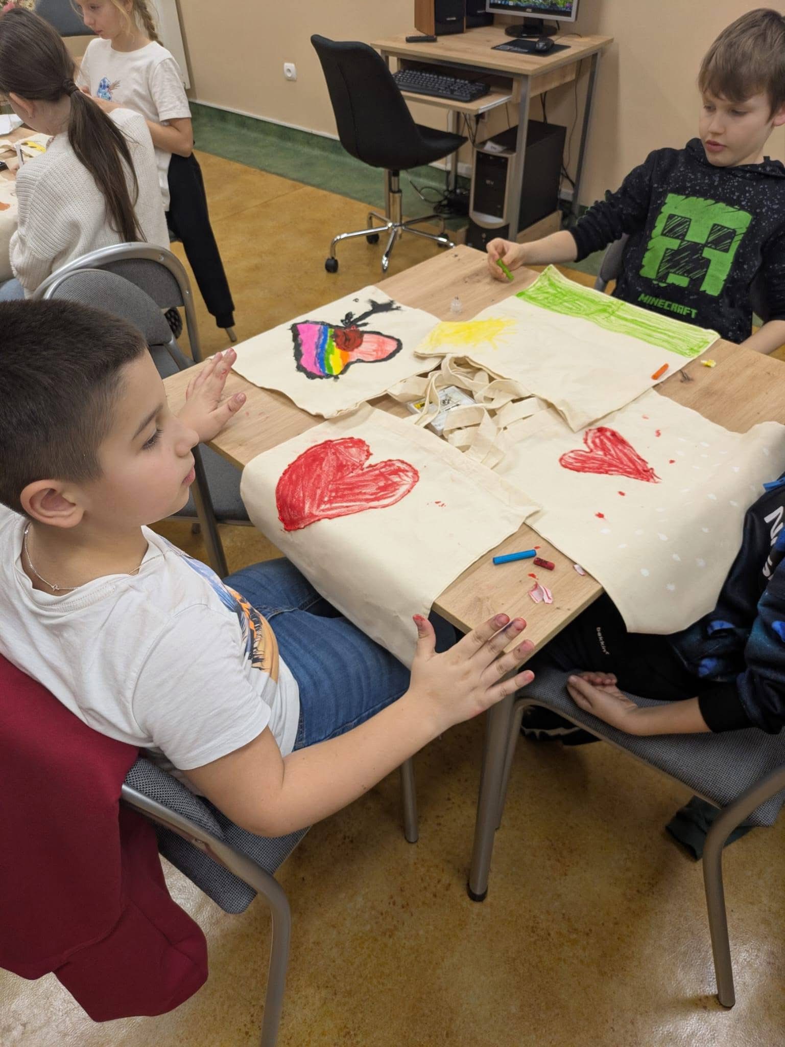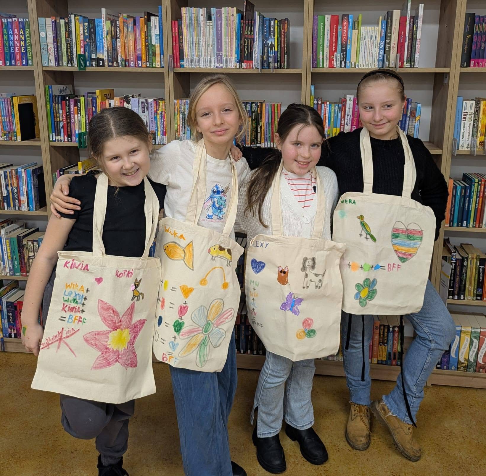 Zamiast tradycyjnych kartek, uczniowie ozdobili bawełniane torby na zakupy. Dzięki autorskim, kolorowym rysunkom, każda z nich stała się niepowtarzalnym i praktycznym upominkiem.