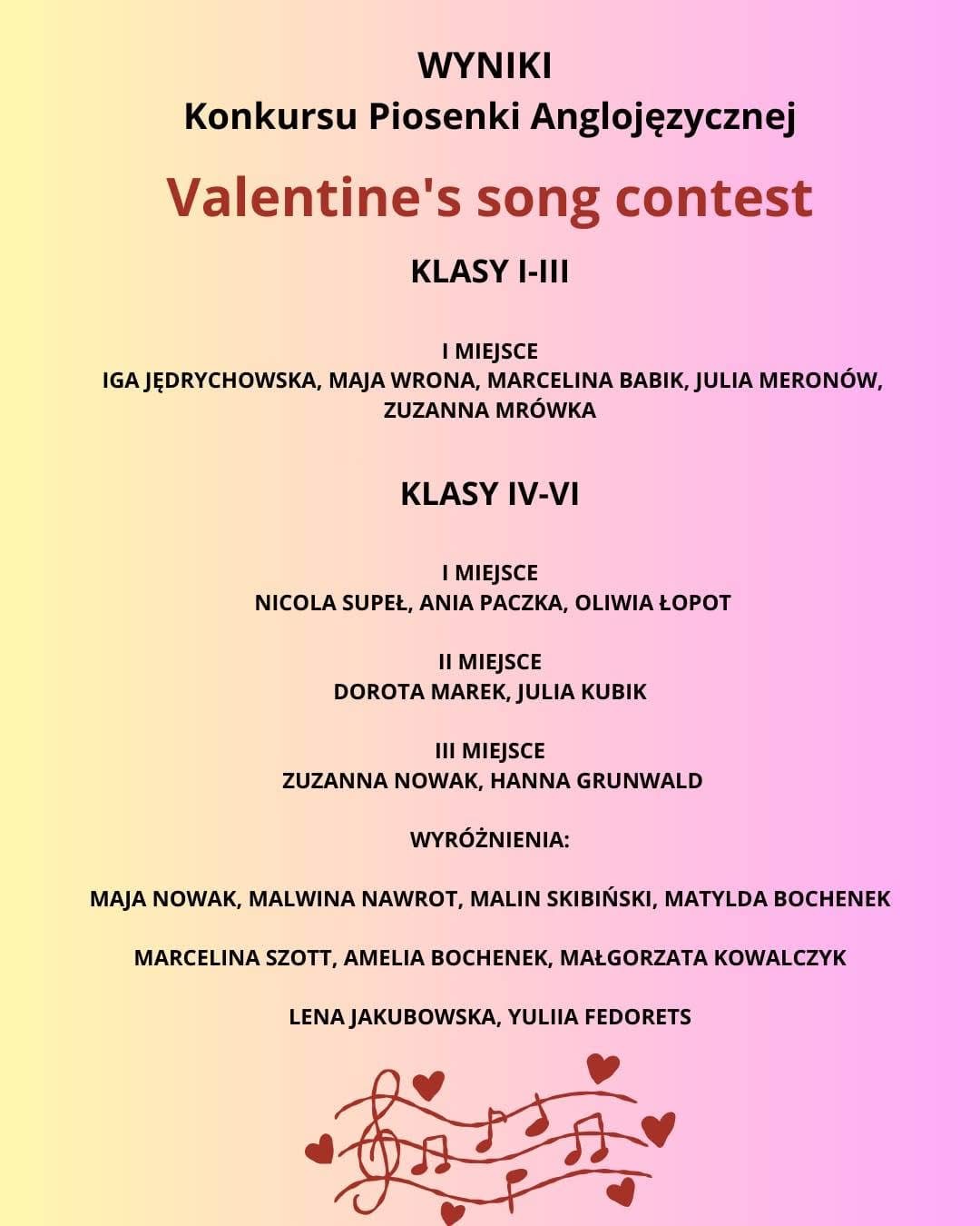 4 lutego w naszej szkole odbył się konkurs piosenki anglojęzycznej Valentine’s Song Contest w dwóch kategoriach wiekowych: klasy 1-3 i 4-6.