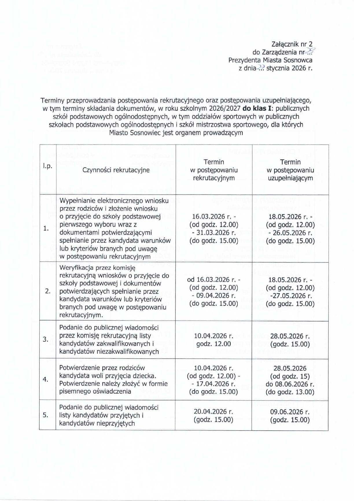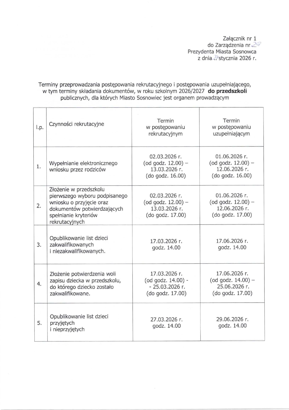 Rekrutacja uzupełniająca odbędzie się w dniach od 1 czerwca 2026 godz. 12:00 – 12 czerwca 2026 do godz. 16:00.Składanie wniosków przez rodziców możliwe będzie wyłącznie przez elektroniczny serwis rekrutacyjny https://przedszkola sosnowiec.nabory.pl/ . Uzupełniony wniosek należy wydrukować, podpisać przez obojga rodziców i dostarczyć do szkoły w nieprzekraczalnym terminie do 12 czerwca 2026 do godz. 17:00.