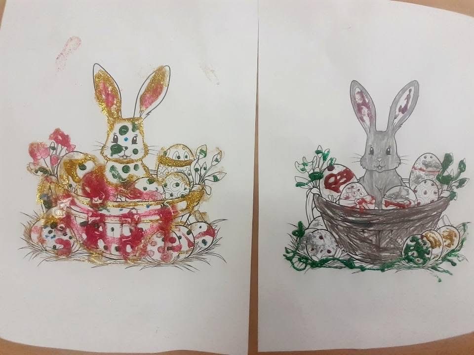 Prace były wykonane technikami mieszanymi, dzięki czemu udało się uzyskać ciekawe efekty. Uczniowie zastosowali: piórka, cekinki, brokatowy klej, kryształki, łupinki jaj, watę, flamastry i blok techniczny.