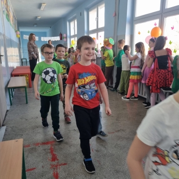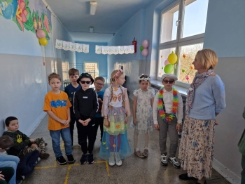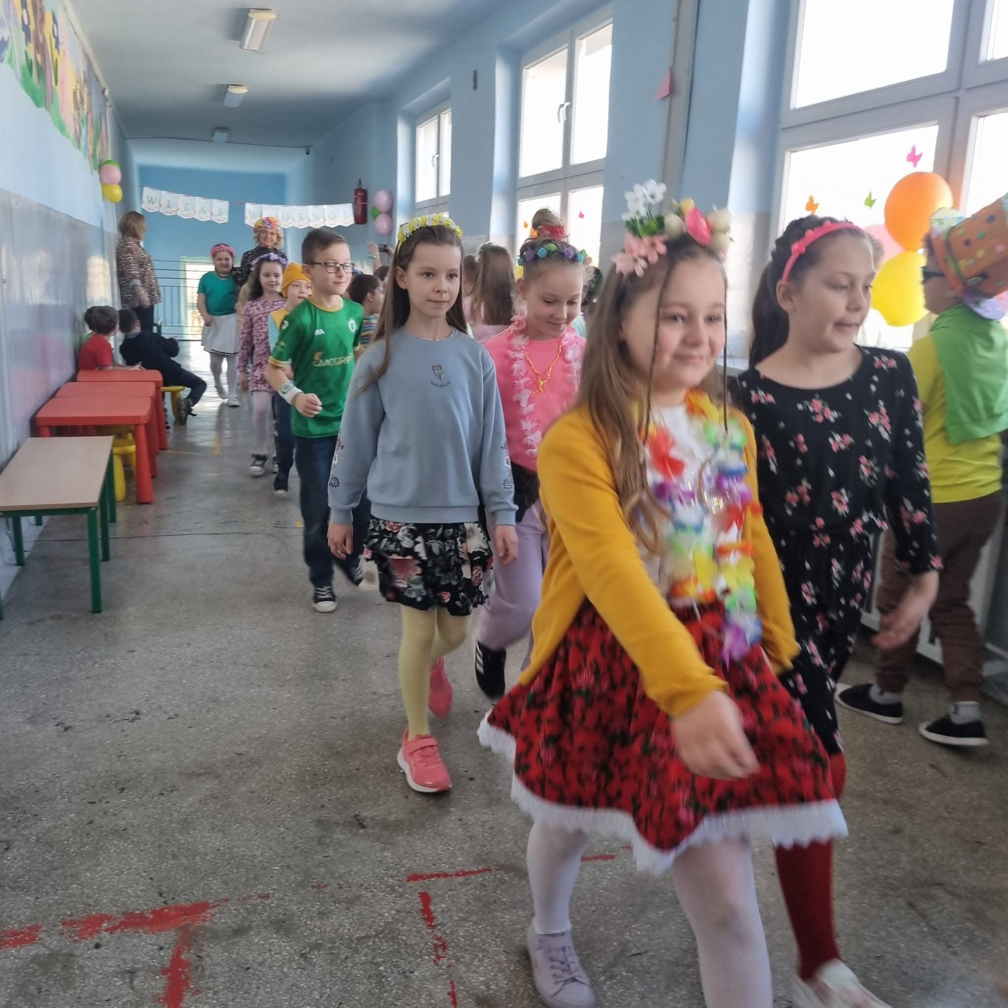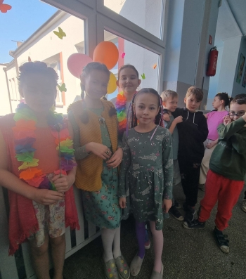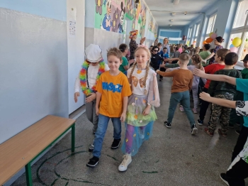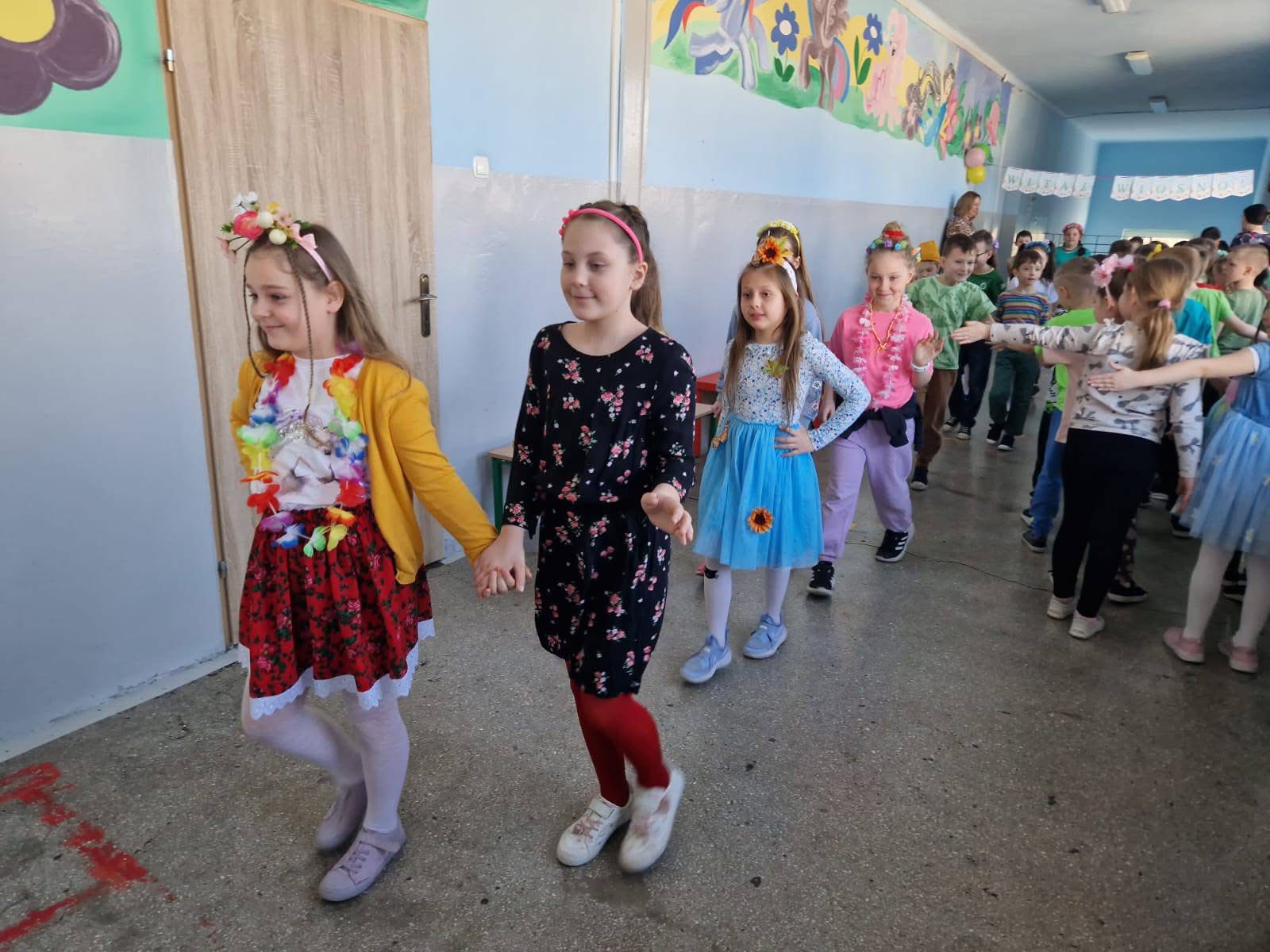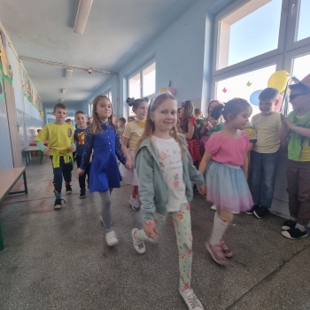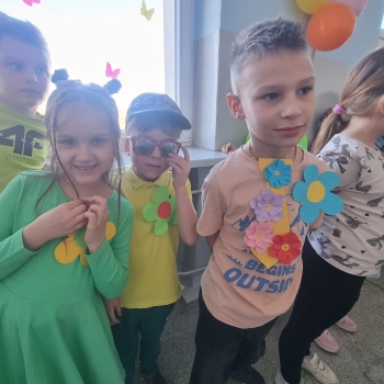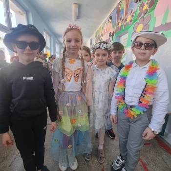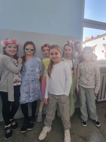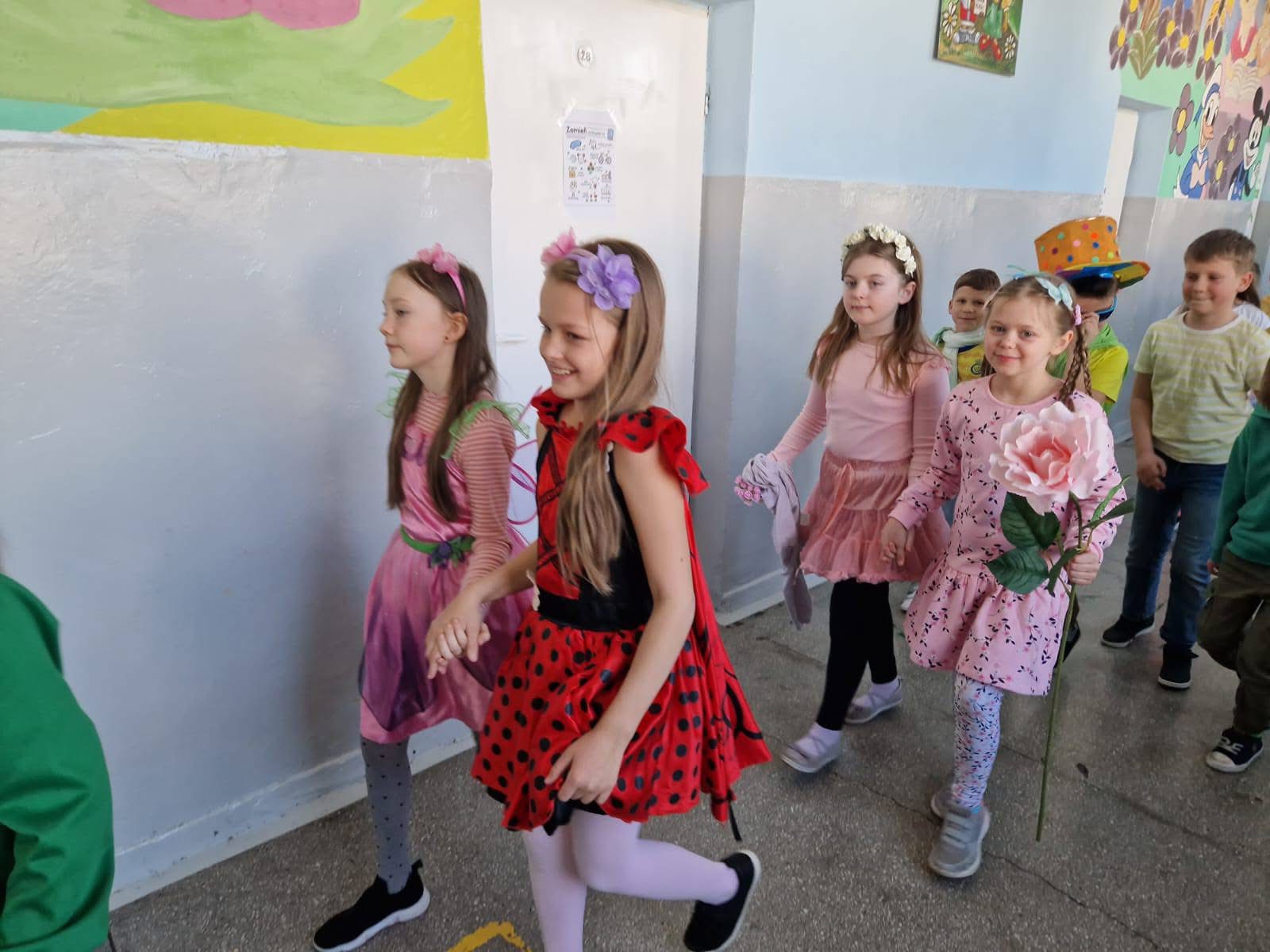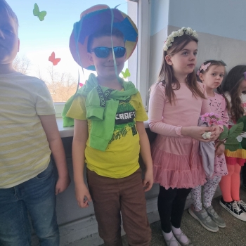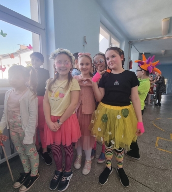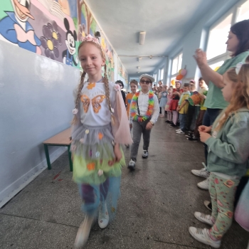 Uczniowie ubrali wiosenne stylizacje, ciekawe nakrycia głowy?, peleryny, płaszczyki, kolorowe spodnie, sukienki ?lub spódnice, wstążki, motyle? lub kwiaty we włosach. ?