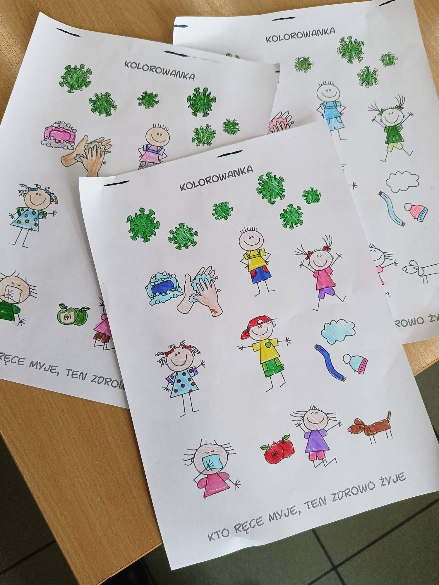 W czasie zajęć przeprowadzonych przez wychowawców klas 1-3 w oparciu o materiały Wojewódzkiej Stacji Sanitarno - Epidemiologicznej uczniowie dowiedzieli się czym są i jak się rozprzestrzeniają wirusy i dlaczego mogą być niebezpieczne. Omówienie zostały i zaprezentowane kolejne kroki prawidłowego mycia rąk. Uczniowie poznali podstawowe zasady, takie jak zakrywa ust przy kaszlu, niedotykanie twarzy brudnymi rękami, unikanie kontaktu z chorymi osobami. Wykonali również karty pracy między innymi wykreślankę z hasłami związanymi z higieną oraz kolorowankę.